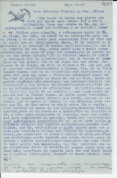 [Carta] 1947 ago. 7, Buenos Aires [a] Gabriela Mistral, Santa Bárbara [manuscrito] Martha [Salotti].