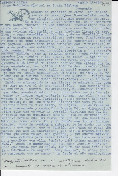 [Carta] 1944 jun. 1, Buenos Aires, [Argentina] [a] Gabriela Mistral, Rio, [Brasil] [manuscrito] Martha [Salotti].