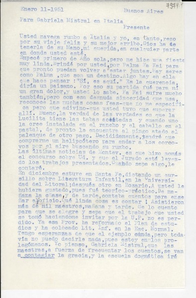 [Carta] 1951 ene. 11, Buenos Aires [a] Gabriela Mistral, Italia [manuscrito] Martha [Salotti].
