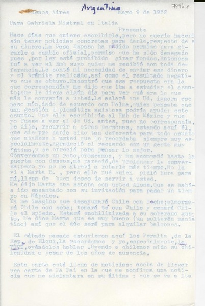 [Carta] 1952 mayo 9, Buenos Aires, [Argentina] [a] Gabriela Mistral, Italia [manuscrito] Martha [Salotti].