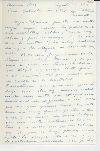 [Carta] 1952 ago. 6, Buenos Aires, [Argentina] [a] Gabriela Mistral, Italia [manuscrito] Martha [Salotti].