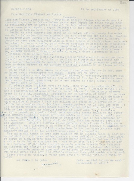 [Carta] 1952 sept. 17, Buenos Aires, [Argentina] [a] Gabriela Mistral, Italia [manuscrito] Martha [Salotti].