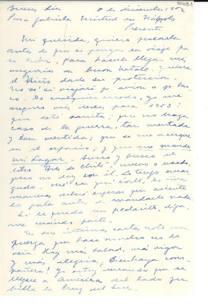 [Carta] 1952 dic. 8, Buenos Aires, [Argentina] [a] Gabriela Mistral, Italia [manuscrito] Martha S[alotti].