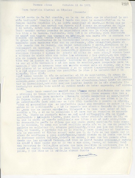 [Carta] 1951 oct. 11, Buenos Aires [a] Gabriela Mistral, Nápoles [manuscrito] Martha [Salotti].