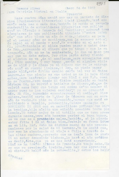 [Carta] 1952 ene. 24, Buenos Aires [a] Gabriela Mistral, Italia [manuscrito] Martha [Salotti].