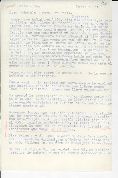 [Carta] 1952 mar. 30, Buenos Aires [a] Gabriela Mistral, Italia [manuscrito] Martha [Salotti].
