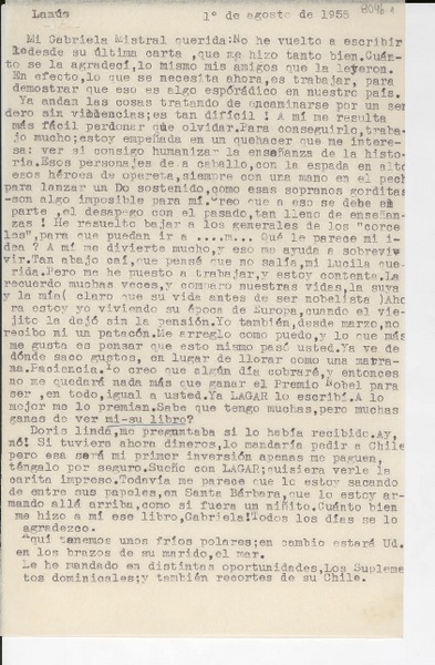 [Carta] 1955 ago. 1, Lanús, [Argentina] [a] Gabriela Mistral [manuscrito] Martha S[alotti].