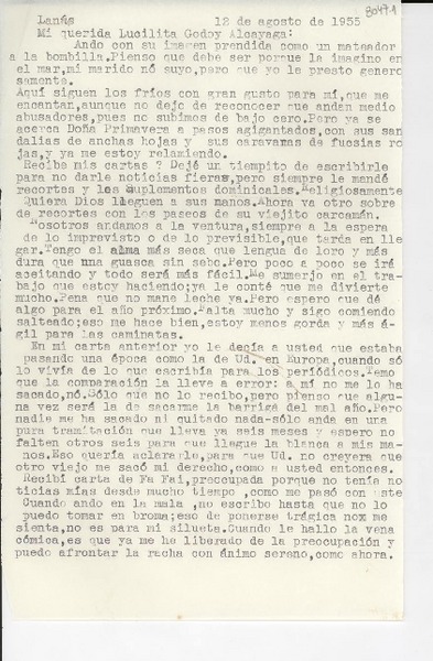 [Carta] 1955 ago. 12, Lanús, [Argentina] [a] Lucilita Godoy Alcayaga [manuscrito] Martha S[alotti].