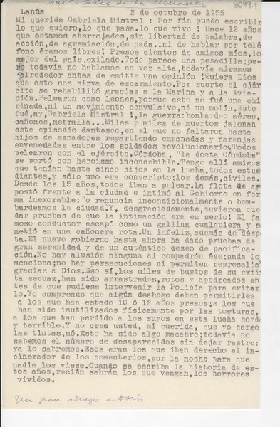 [Carta] 1955 oct. 2, Lanús, [Argentina] [a] Gabriela Mistral [manuscrito] Martha S[alotti].
