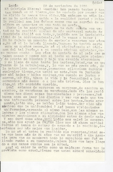 [Carta] 1955 nov. 22, Lanús, [Argentina] [a] Gabriela Mistral [manuscrito] Martha S[alotti].