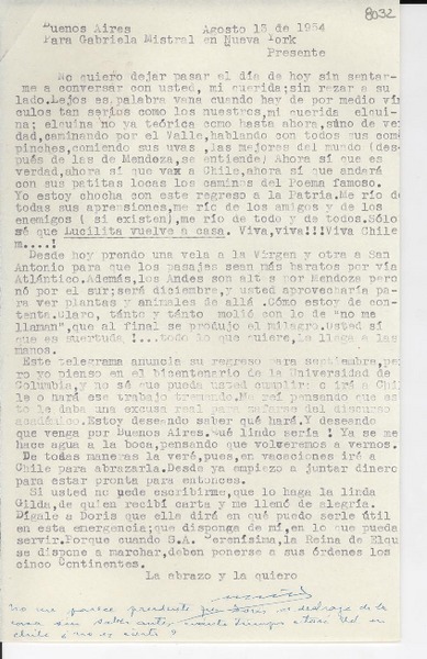 [Carta] 1954 ago. 13, Buenos Aires [a] Gabriela Mistral, Nueva York [manuscrito] Martha [Salotti].