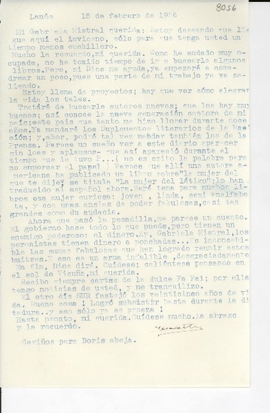 [Carta] 1956 feb. 15, Lanús, [Argentina] [a] Gabriela Mistral [manuscrito] Martha [Salotti].
