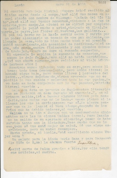 [Carta] 1956 mayo 20, Lanús, [Argentina] [a] Gabriela Mistral [manuscrito] Martha [Salotti].