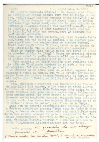 [Carta] 1944 sept. 5, Buenos Aires, [Argentina] [a] Gabriela Mistral, Rio, [Brasil] [manuscrito] Martha [Salotti].