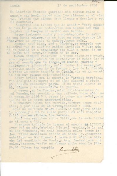 [Carta] 1956 sept. 17, Lanús, [Argentina] [a] Gabriela Mistral [manuscrito] Martha [Salotti].