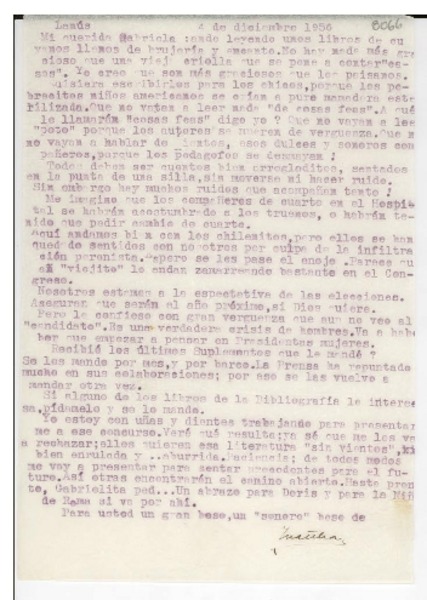 [Carta] 1956 dic. 4, Lanús, [Argentina] [a] Gabriela [Mistral] [manuscrito] Martha [Salotti].