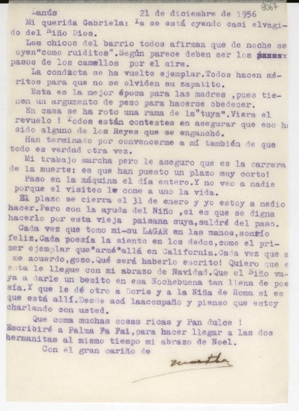 [Carta] 1955 dic. 26, Lanús, [Argentina] [a] Gabriela Mistral [manuscrito] Martha [Salotti].