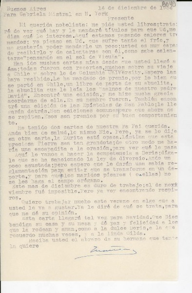 [Carta] 1954 dic. 14, Buenos Aires [a] Gabriela Mistral, Nueva York [manuscrito] Martha [Salotti].