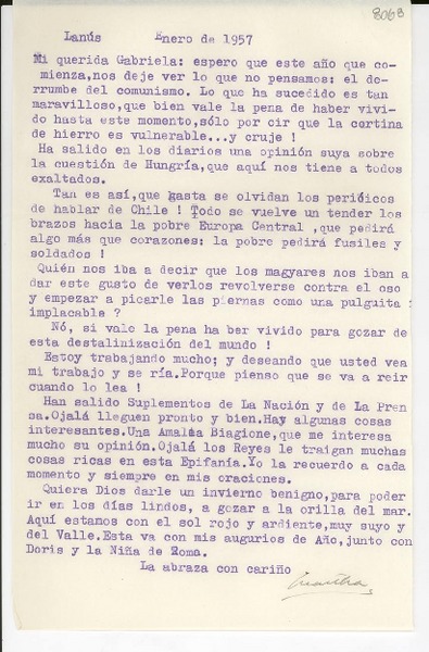 [Carta] 1957 ene., Lanús, [Argentina] [a] Gabriela [Mistral] [manuscrito] Martha [Salotti].