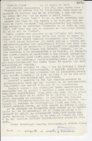 [Carta] 1955 ene. 11, Buenos Aires [a] Gabriela Mistral [manuscrito] Martha [Salotti].