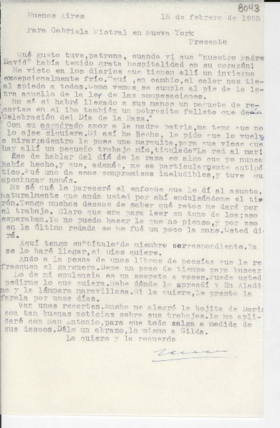 [Carta] 1955 feb. 15, Buenos Aires [a] Gabriela Mistral, Nueva York [manuscrito] Martha [Salotti].