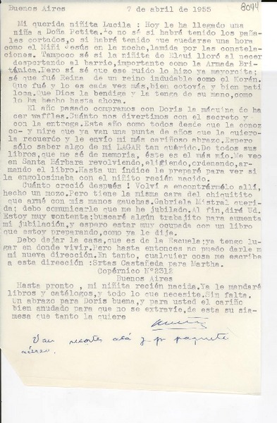 [Carta] 1955 abr. 7, Buenos Aires [a] Gabriela Mistral [manuscrito] Martha [Salotti].