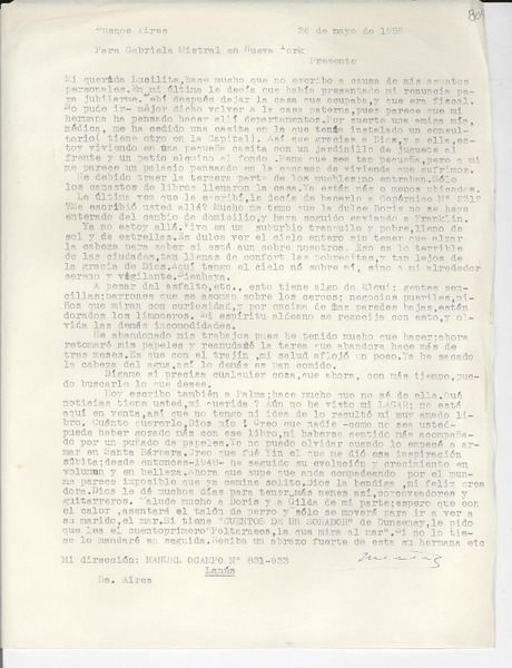 [Carta] 1955 mayo 26, Buenos Aires [a] Gabriela Mistral, Nueva York [manuscrito] Martha [Salotti].