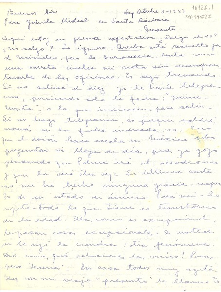 [Carta] 1943 oct. 18, Buenos Aires, [Argentina] [a] Gabriela Mistral, Río [de Janeiro, Brasil] [manuscrito] Martha A. Salotti.