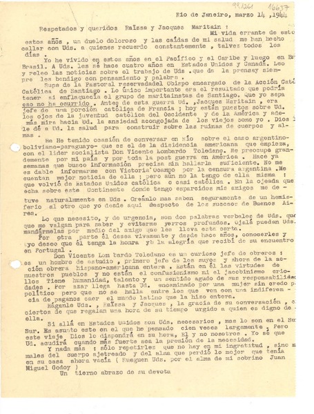 [Carta] 1944 mar. 14, Rio de Janeiro, [Brasil] [a los] Respetados y queridos Raissa y Jacques Maritain [manuscrito] [Gabriela Mistral].