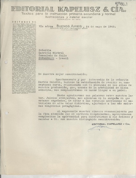[Carta] 1945 mayo 24, Buenos Aires, [Argentina] [a] Gabriela Mistral, Consulado de Chile, Petrópolis, Brasil [manuscrito] Editorial Kapelusz.