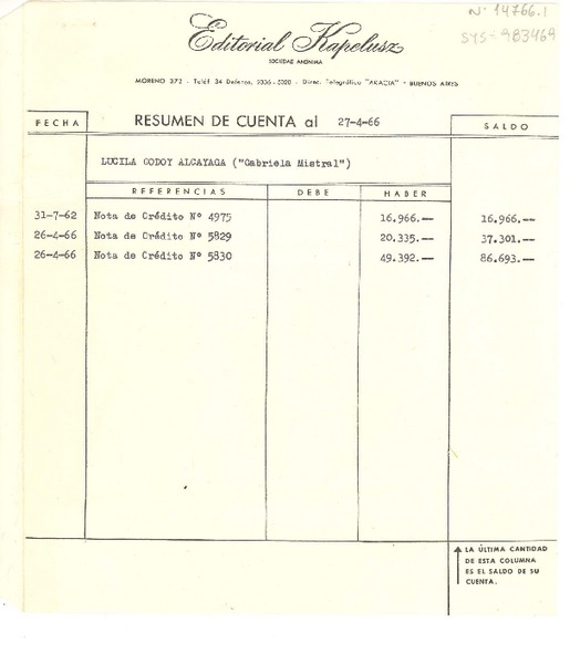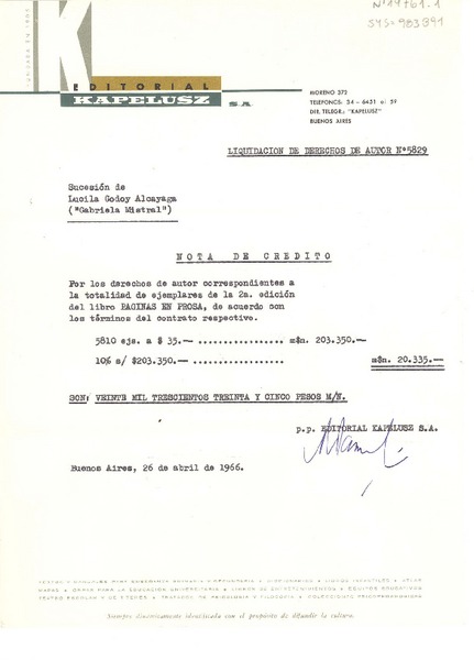 [Carta] 1966 abr. 26, Buenos Aires, [Argentina] [a] Sucesión de Lucila Godoy Alcayaga ("Gabriela Mistral") [manuscrito] Editorial Kapeluz S.A.