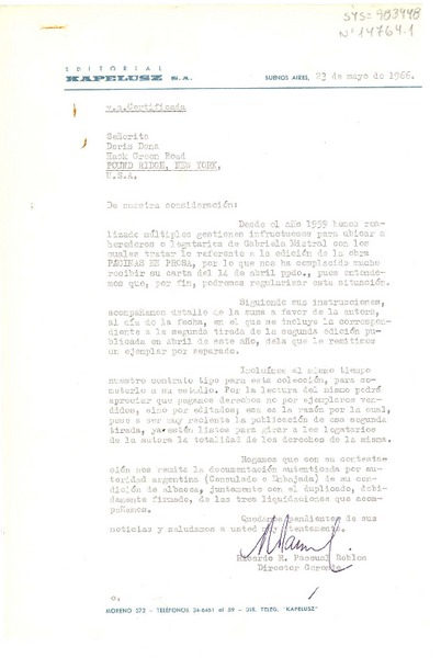 [Carta] 1966 mayo 23, Buenos Aires, [Argentina] [a] Doris Dana, Pound Ridge, New York, U.S.A. [manuscrito] Ricardo R. Pascual Robles, director gerente.