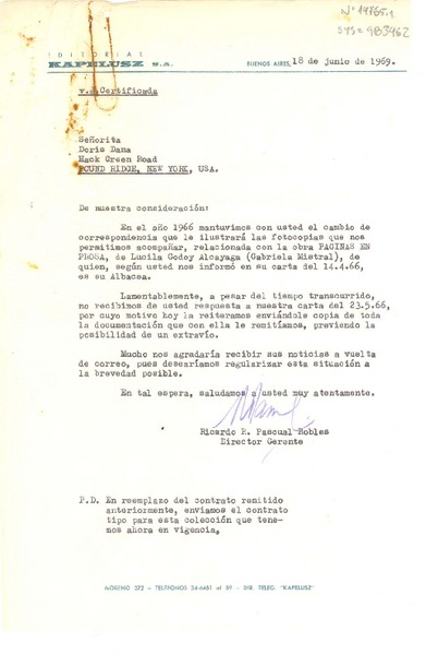 [Carta] 1966 jun. 18, Buenos Aires, [Argentina] [a] Doris Dana, Pound Ridge, New York, U.S.A. [manuscrito] Ricardo R. Pascual Robles, director gerente.