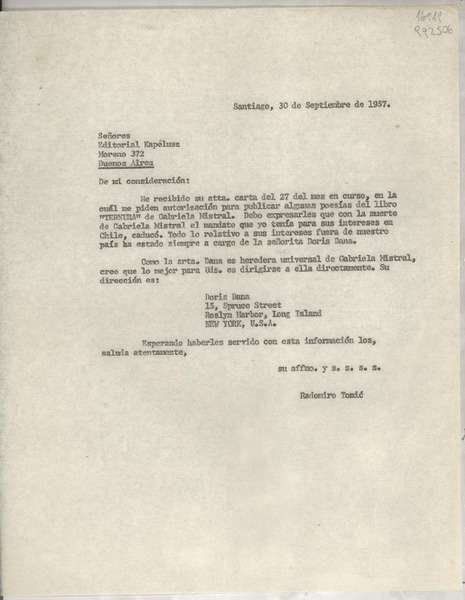 [Carta] 1957 sept. 30, Santiago, [Chile] [a los] Señores Editorial Kapelusz, Moreno 372, Buenos Aires, [Argentina] [manuscrito] Radomiro Tomic.
