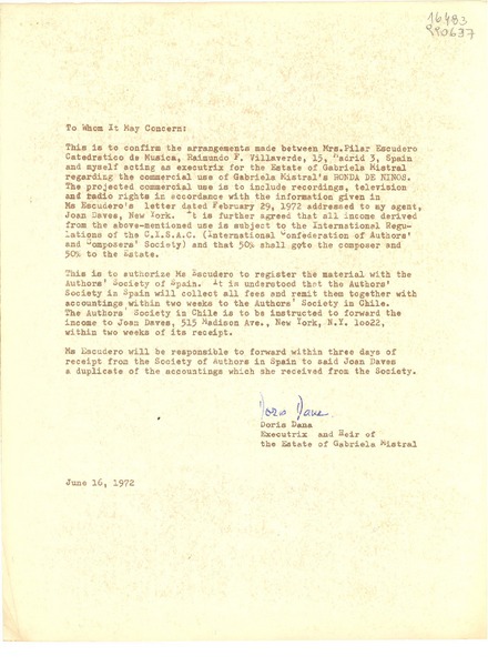 [Carta] 1972 June 16, [EE.UU.] [a] To Whom It May Concern [manuscrito] Doris Dana, Executrix and Heir of the Estate of Gabriela Mistral.