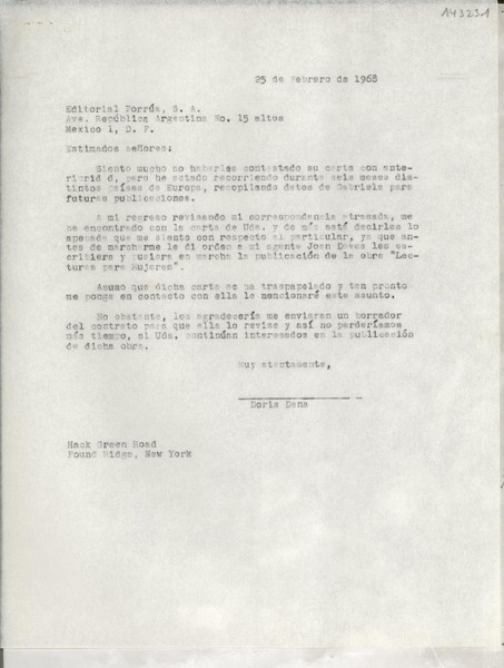 [Carta] 1968 feb. 25, Hack Green Road, Pound Ridge, New York, [EE.UU.] [a la] Editorial Porrúa, S.A., Ave. República Argentina N°. 15 altos, México 1, D. F., México [manuscrito] Doris Dana.