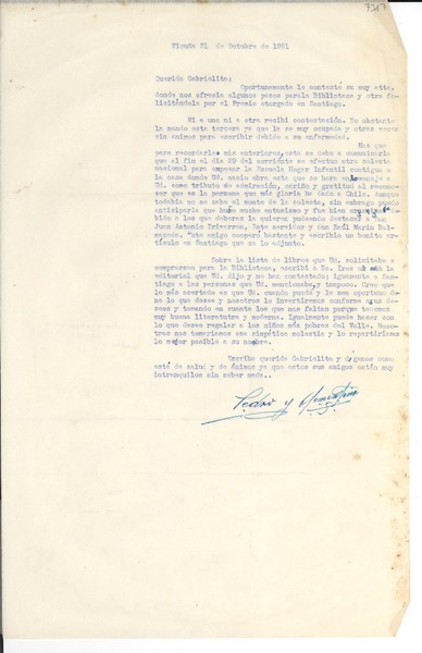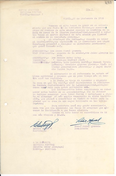 Mistral, Gabriela - Moral, Pedro - Barraza de Estay, Isolina - Manuscritos españoles - Correspondencia