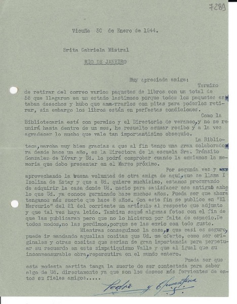 [Carta] 1944 ene. 30, Vicuña [Chile] [a] Gabriela Mistral, Río de Janeiro [manuscrito] Pedro Moral.