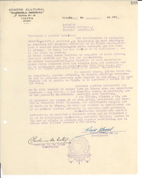 [Carta] 1944 dic. 18, Vicuña [Chile] [a] Gabriela Mistral, Petrópolis, Brasil [manuscrito] Pedro Moral.