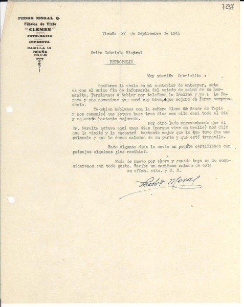 [Carta] 1945 sept. 27, Vicuña [Chile] [a] Gabriela Mistral, Petrópolis [manuscrito] Pedro Moral.