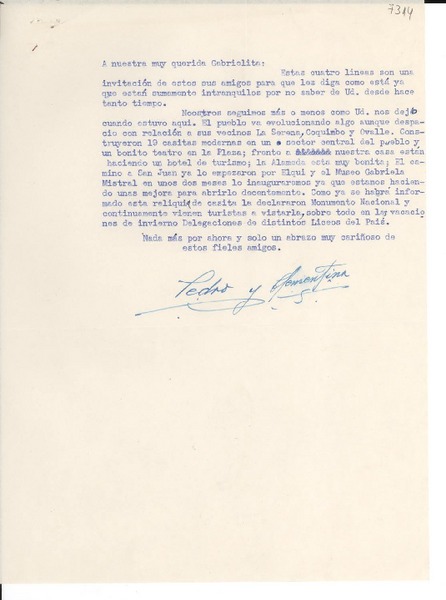 [Carta] [1951?], [Vicuña?], [Chile] [a] Gabrielita [Mistral] [manuscrito] Pedro [Moral Q.].