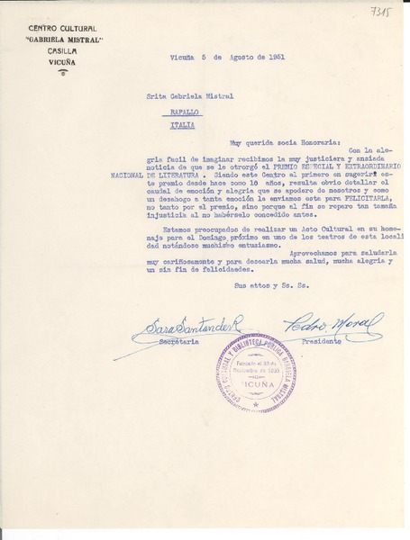 [Carta] 1951 ago. 5, Vicuña, [Chile] [a] Gabriela Mistral, Rapallo, Italia [manuscrito] Pedro Moral, Sara Santander R.