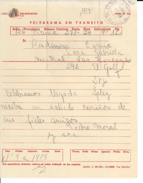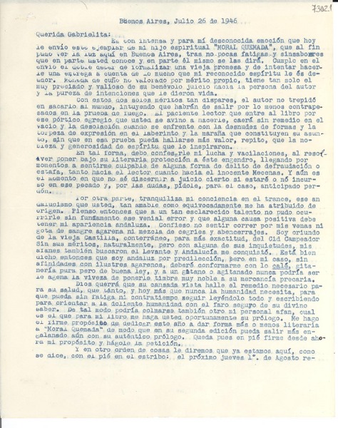 [Carta] 1946 jul. 26, Buenos Aires [a] Gabriela Mistral [manuscrito] Pedro Moral.