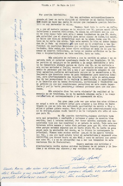 [Carta] 1953 mayo 17, Vicuña, [Chile] [a la] Muy querida Gabrielita [Mistral] [manuscrito] Pedro Moral.