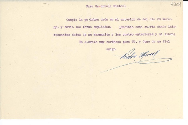 [Carta] 1949 mar. 24, Vicuña [Chile] [a] Gabriela Mistral [manuscrito] Pedro Moral.