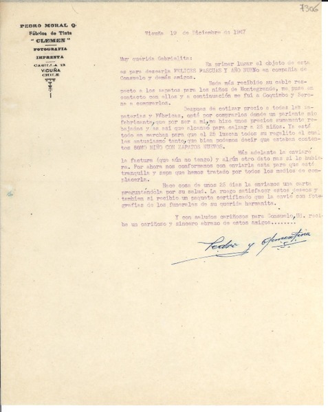[Carta] 1947 dic. 19, Vicuña [Chile] [a] Gabriela Mistral [manuscrito] Pedro Moral.