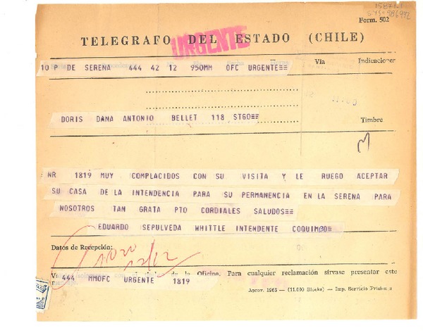 [Telegrama] [1965 dic. 20?], Coquimbo, [Chile] [a] Doris Dana, Santiago, [Chile] [manuscrito] Eduardo Sepúlveda Whittle.