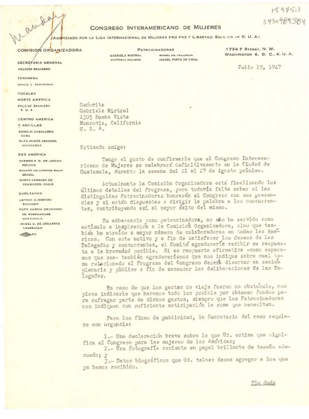 [Carta] 1947 jul. 19, [Washington D.C., E.U.A.] [a] Gabriela Mistral, Monrovia, California, U.S.A. [manuscrito] Heloise Brainerd.