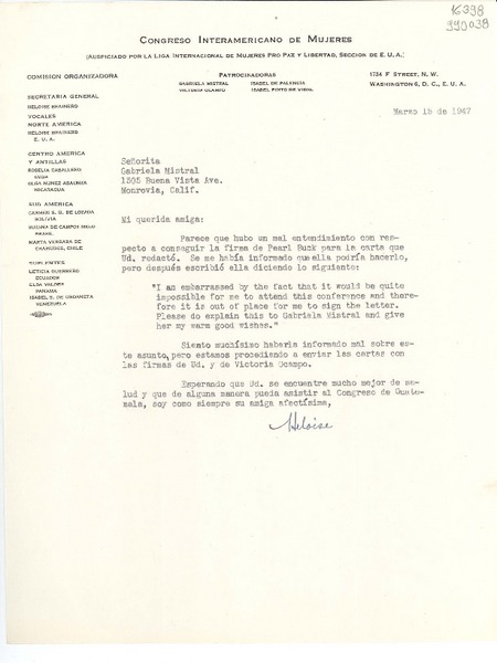 [Carta] 1946 mar. 14, 1734 F Street, N. W., Washington, D. C., [EE.UU.] [a la] Srita. Gabriela Mistral, co Mrs. Migel, 770 Park Ave., New York, [EE.UU.] [manuscrito] / Heloise Brainerd, Sria. Gral., Comisión Organizadora del Congreso Interamericano de Mujeres.