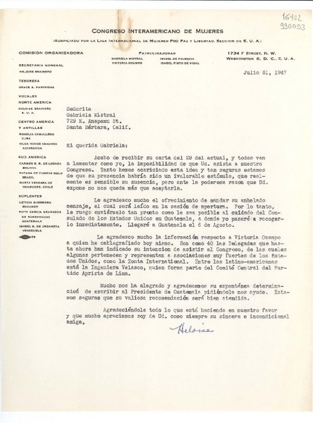 [Carta] 1947 jul. 31, Washington D. C., [Estados Unidos] [a] Señorita Gabriela Mistral, 729 E. Anapamu St., Santa Bárbara, Calif. [manuscrito] Heloise Brainerd.